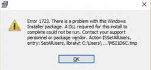 2) When running a downloaded installer, Error 1723 with a screen similar to that shown below may appear: